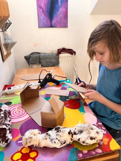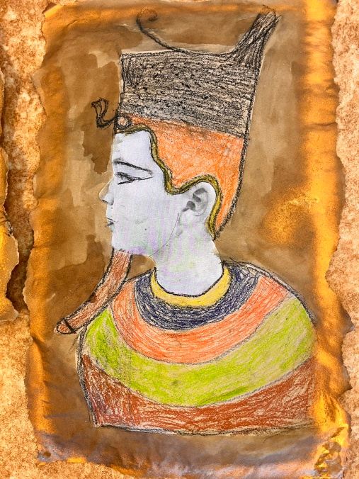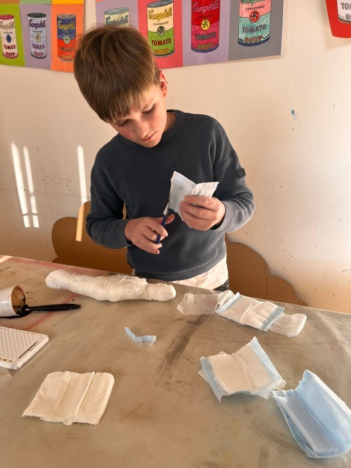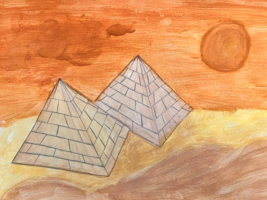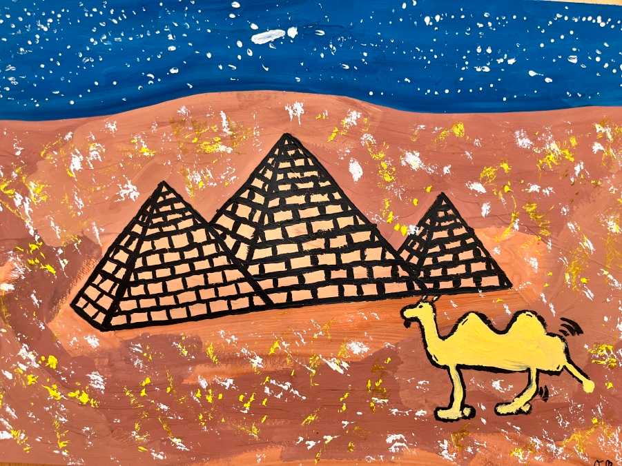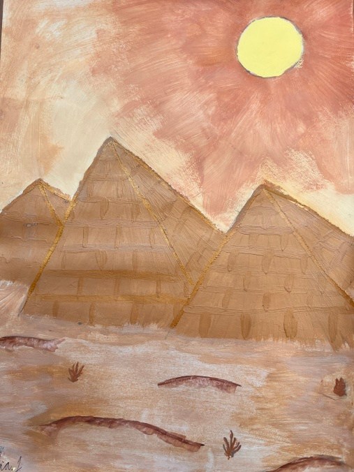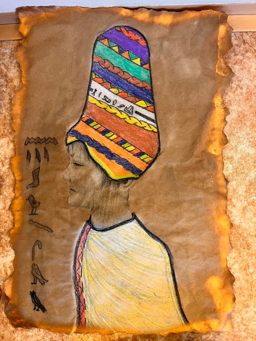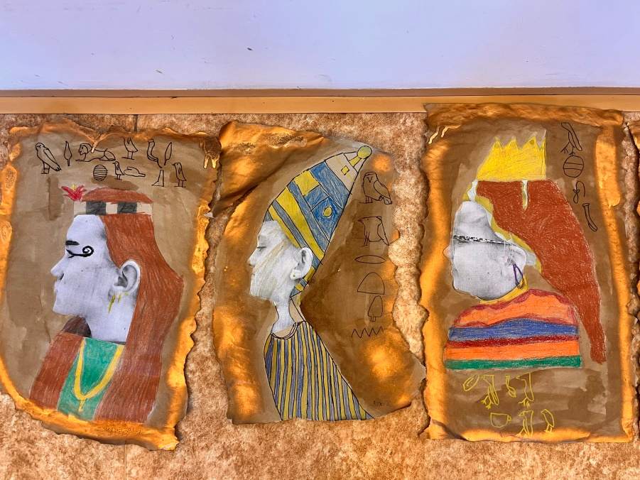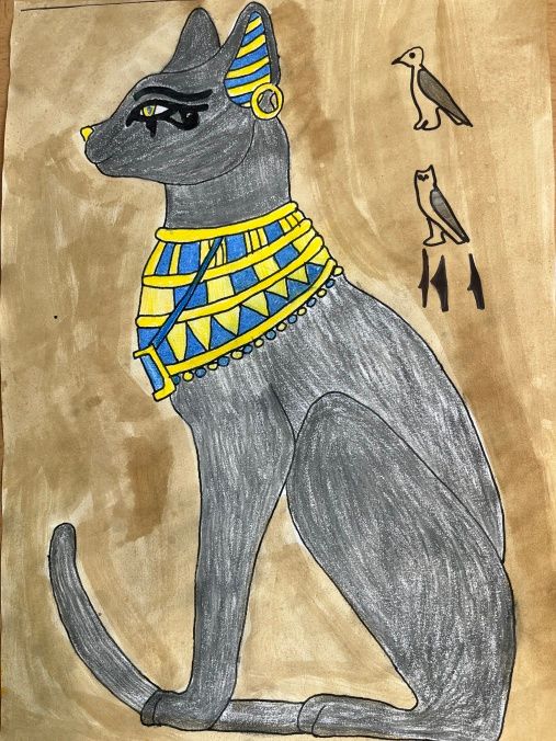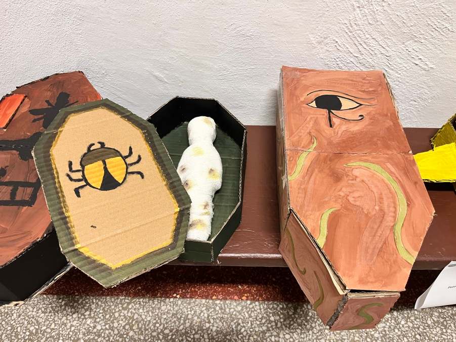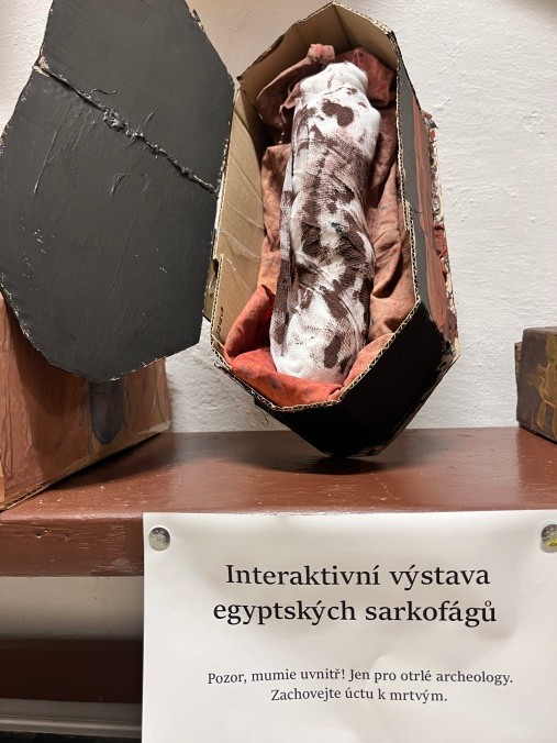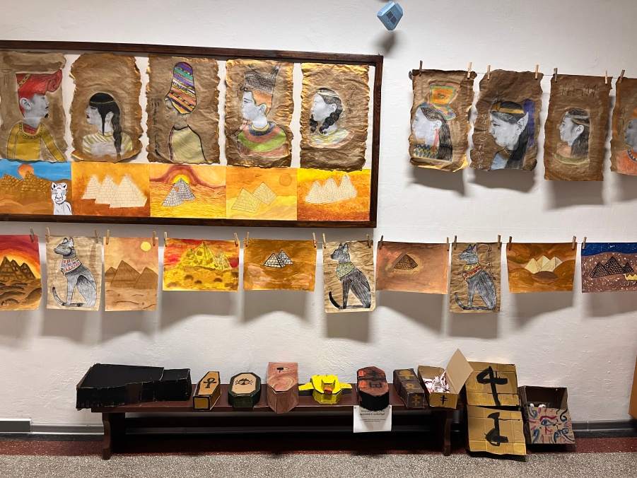 Šesťáci připravili v rámci propojování předmětu výtvarka a dějepis přehlídku egyptského umění. Vystupují na ni ve slavnostním starověkém účesu. Připravili ozdobné sarkofágy s mumifikovanými panovníky. Vše stráží posvátné kočky a skarabeové. Magda Komárková