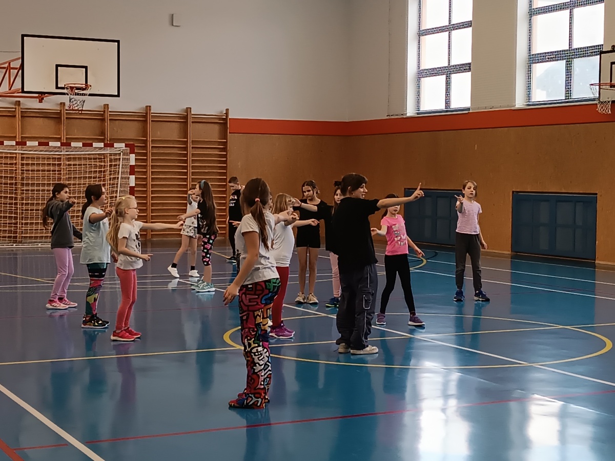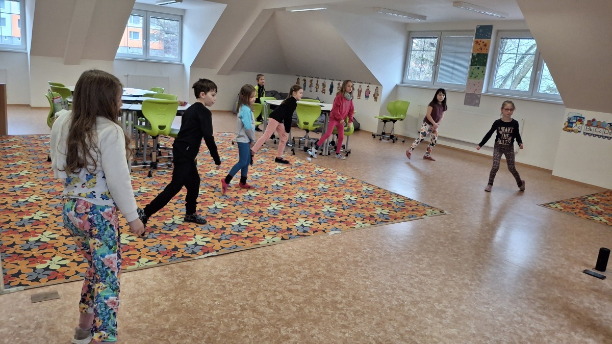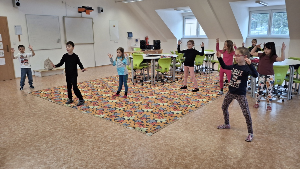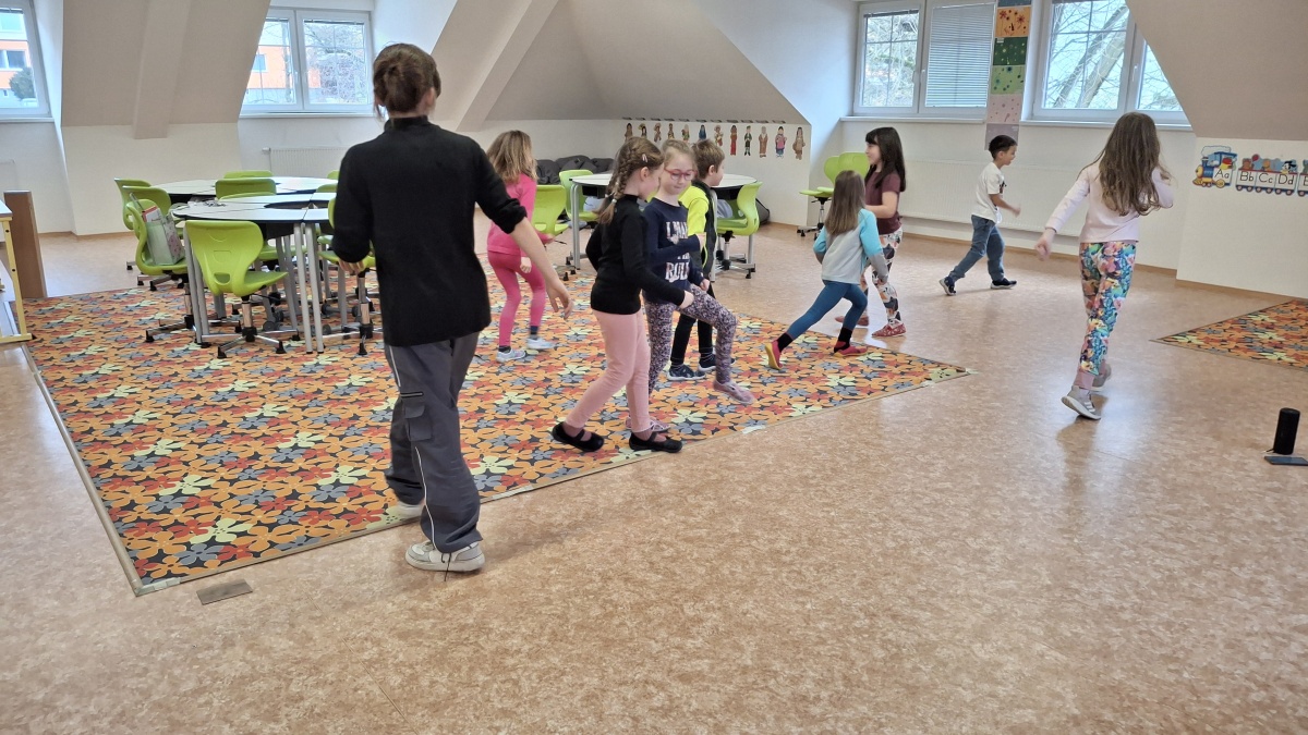 V pondělí odpoledne strávily děti ŠD v příjemné atmosféře školní tělocvičny, která se proměnila v prostor plný hudby a tance. Za doprovodu studentky Kačky rozvíjely své taneční a pohybové dovednosti.